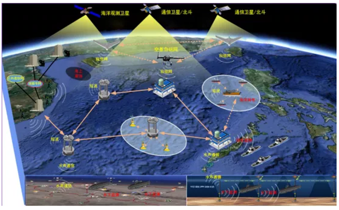 与现有海洋通信网络相比,新型海洋通信网络旨在解决天、空、岸、海、潜的立体组网、多元异构网络间的融合互联及业务与网络资源的上下协同,提升网络整体的协调性和资源的利用率,构建面向海洋综合感知的多网系高效融合互联的网络空间。